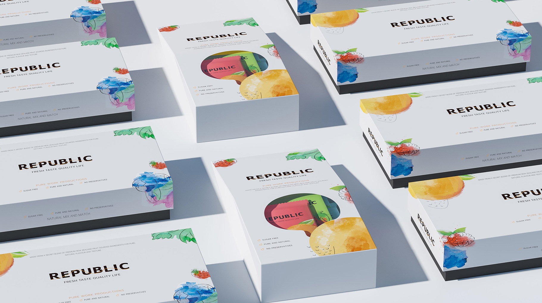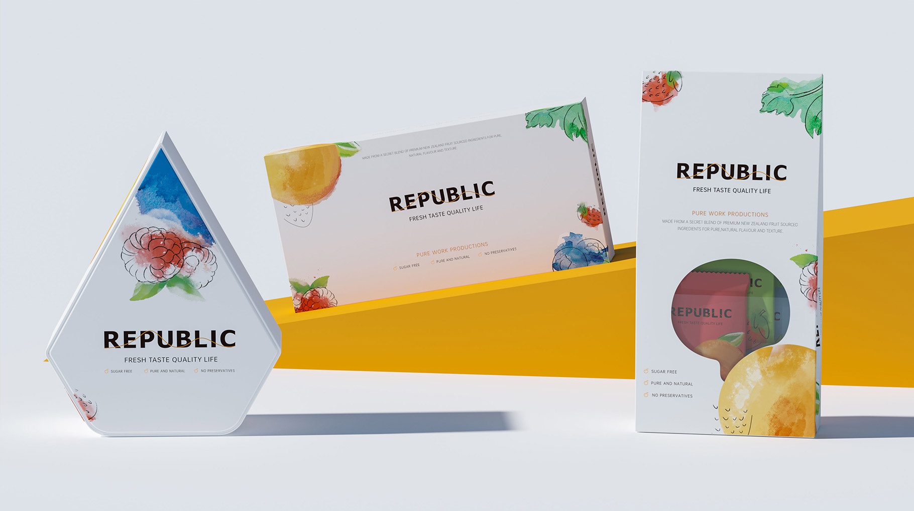 REPUBLIC水果味巧克力包裝設計以簡約及時尚的設計風格對產品進行品牌包裝,區別市面上傳統的濃郁厚重的設計風格,以水果結合水彩的表現手法,打造年輕化的產品體驗,為品牌再在消費市場帶來耳目一新的視覺感官體驗。
