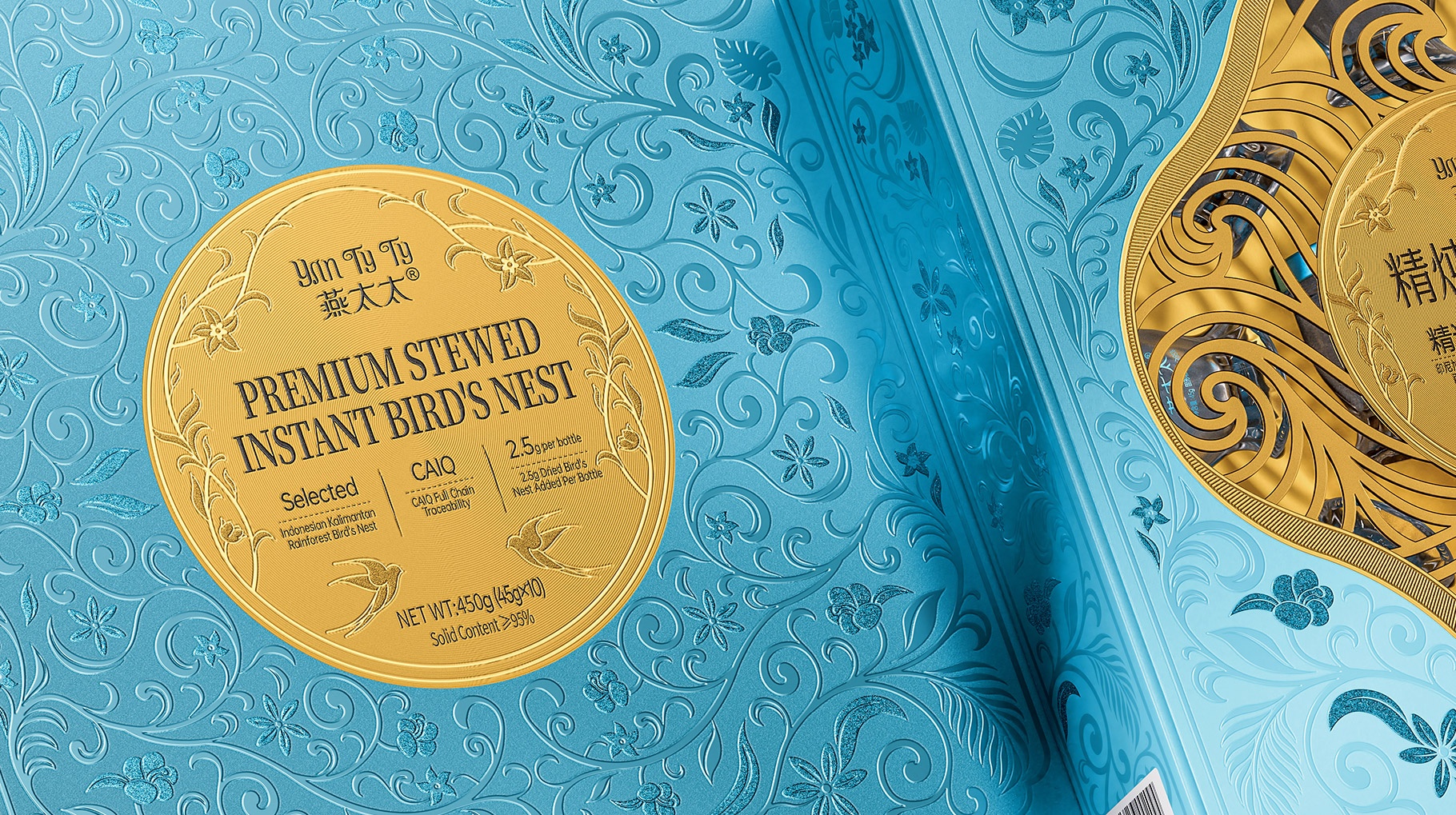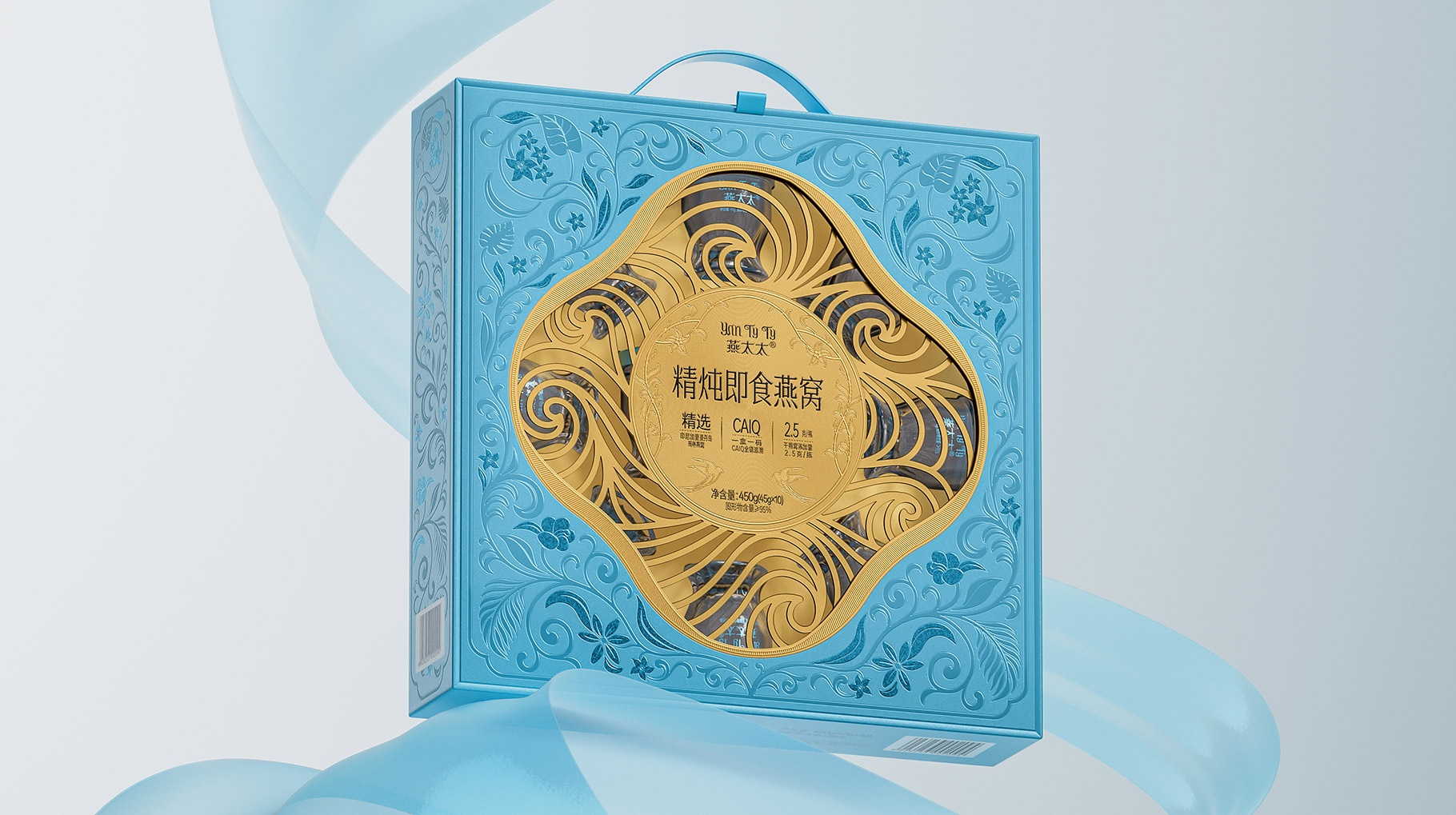 整體包裝創(chuàng)意以獨(dú)創(chuàng)三層視覺(jué)敘事:中部采用東方園林“框景”手法打造鏤空視窗,湖藍(lán)色藤蔓紋樣層疊延展,再現(xiàn)雨林生態(tài)的呼吸韻律,虛實(shí)交錯(cuò)間透現(xiàn)燕窩瑩潤(rùn)質(zhì)感。
