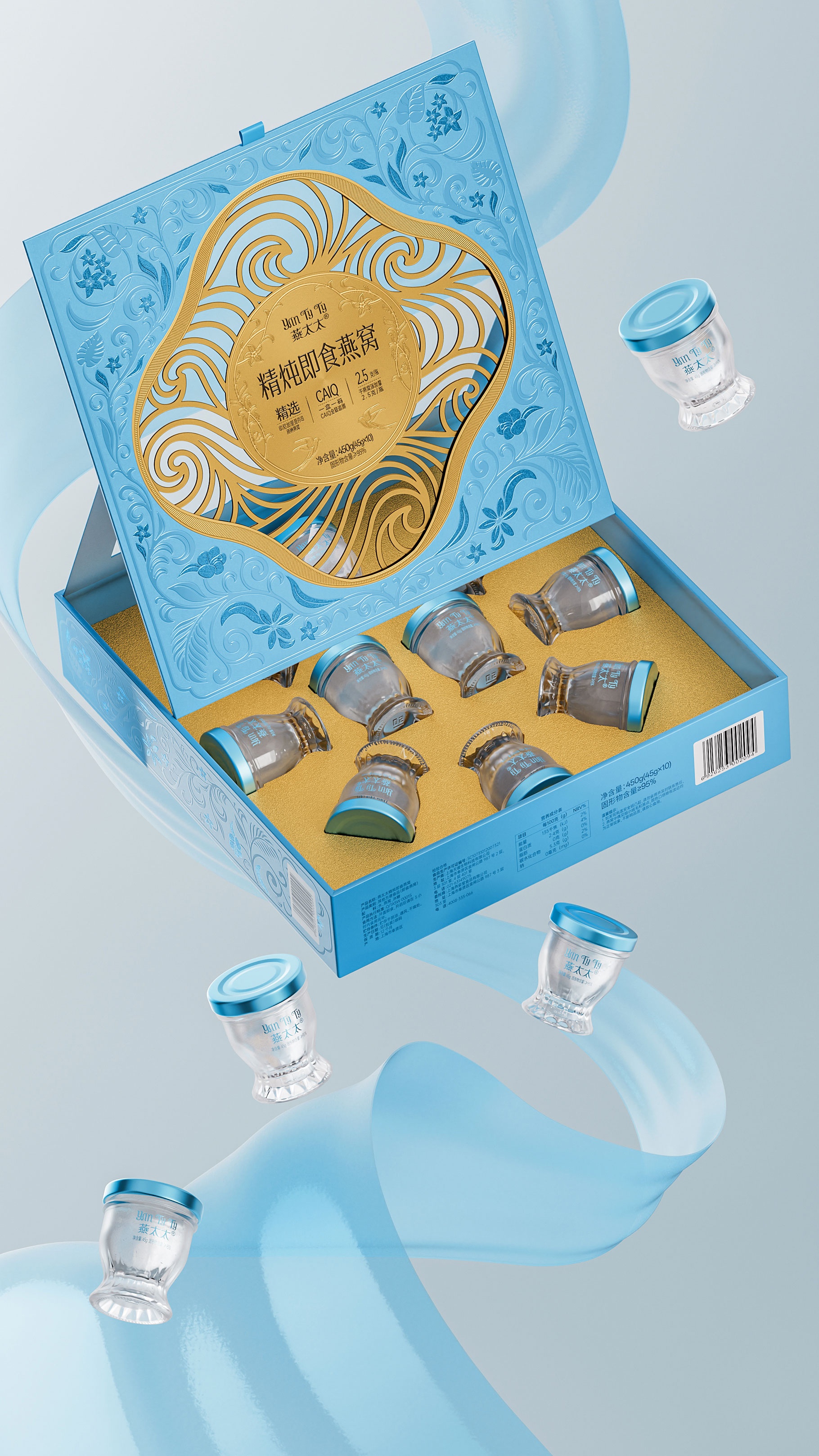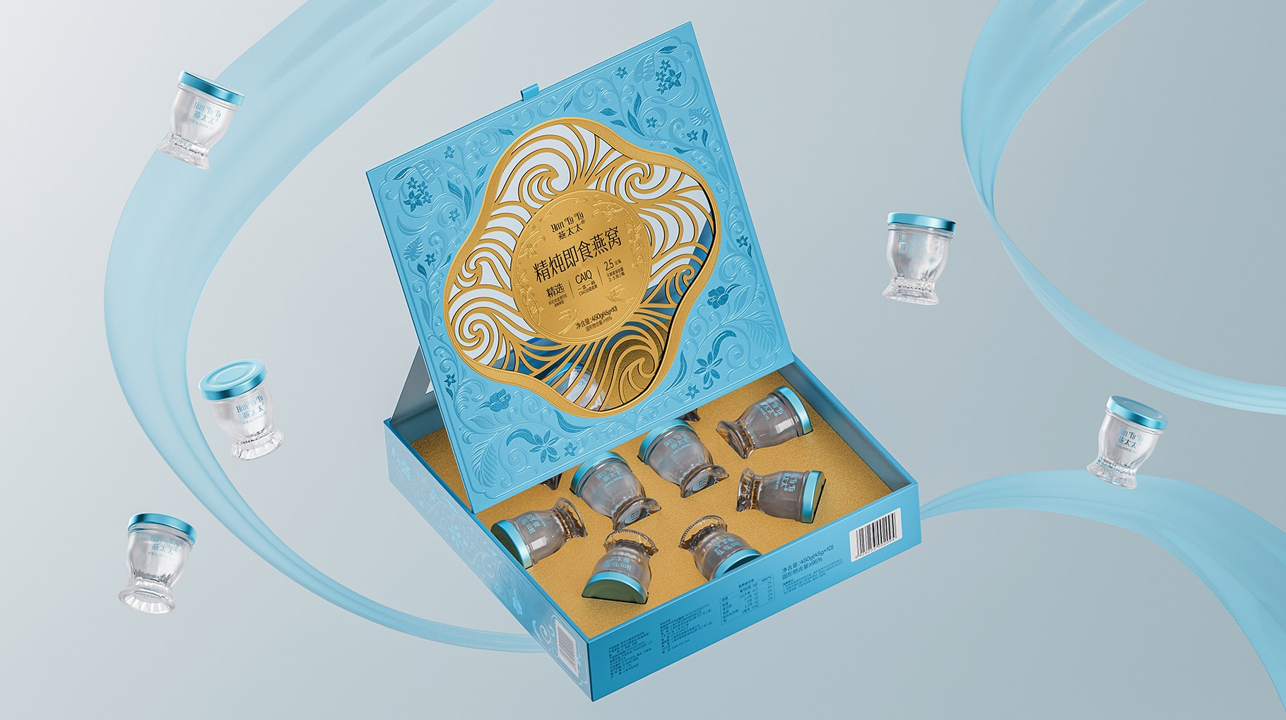 功能細(xì)節(jié)上,瓶身采用食品級(jí)水晶玻璃與氮?dú)怄i鮮工藝,確保燕窩品質(zhì);瓶底拋光切面,在光影下折射出琥珀色光澤,暗合傳統(tǒng)滋補(bǔ)文化的貴重屬性。
